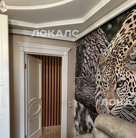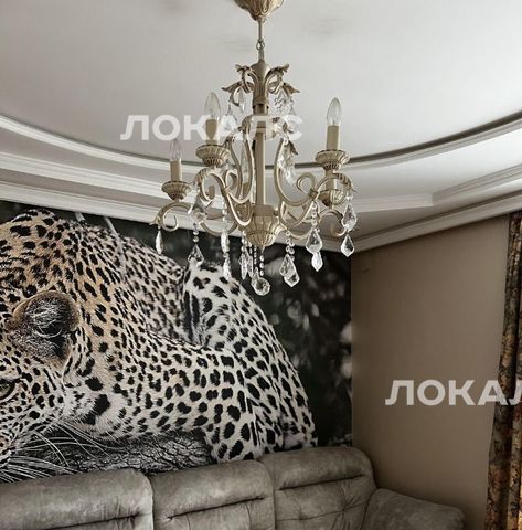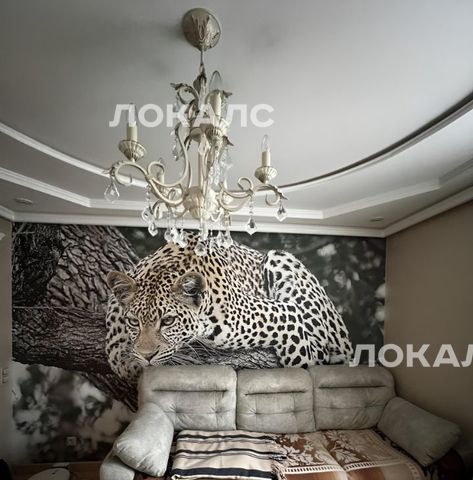 Комната 12,6 кв.м. пол паркетная доска, на одной стене текстурные обои имитирующие художественный холст, с изображением леопарда. Трехуровневый потолок, люстра, 4 светодиодные лампочки и дополнительная подсветка лента по квадрату.