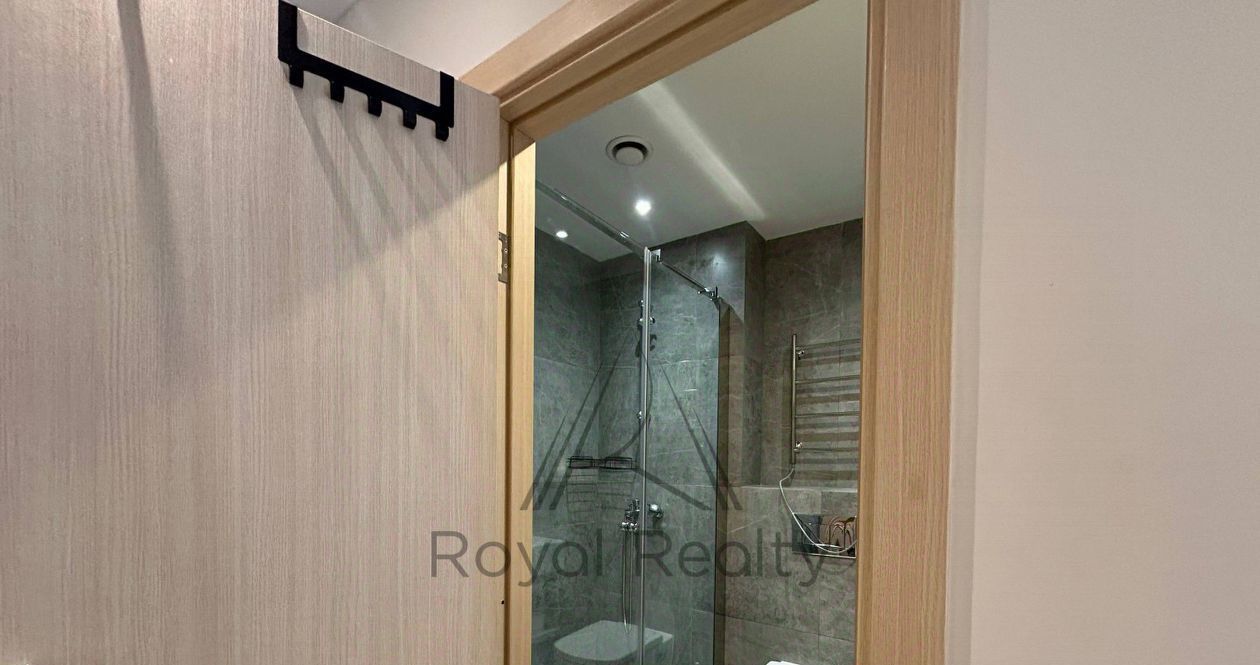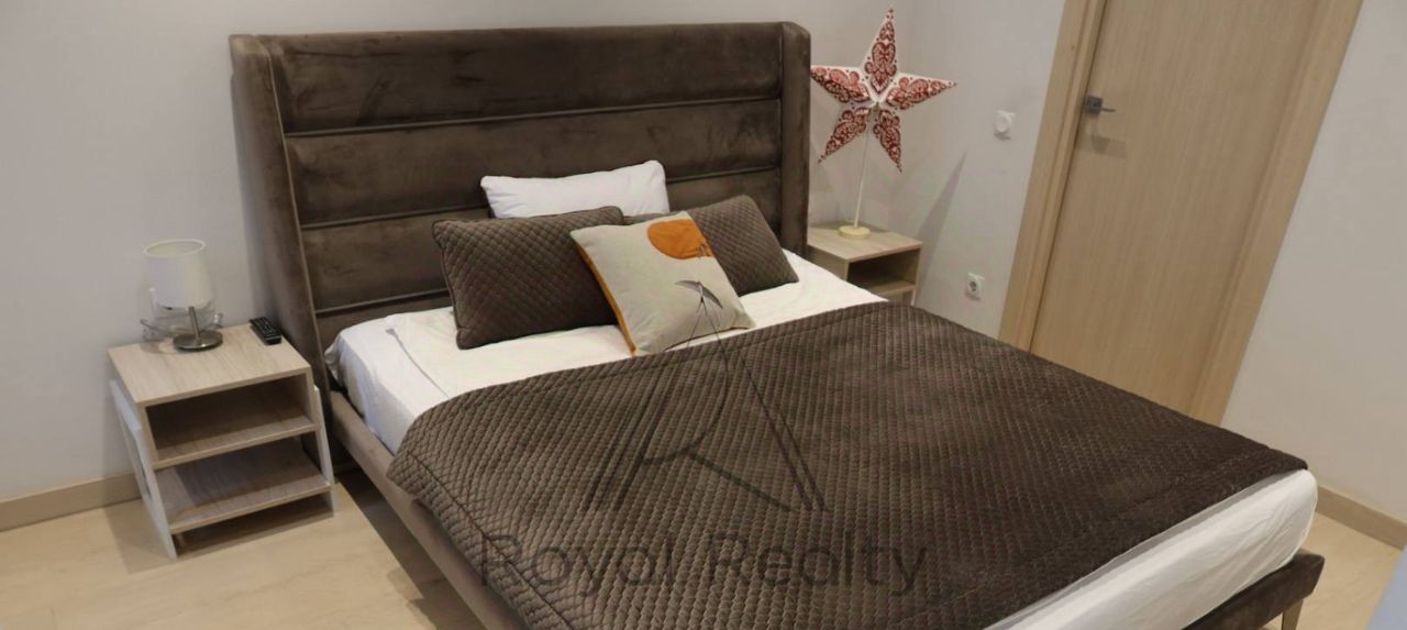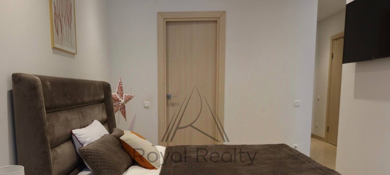 Спальня оборудована большой двуспальной кроватью и постельным бельем. Совмещенный санузел с душевой кабиной выполнен в современном стиле, что создает ощущение свежести и комфорта. В квартире есть просторная гардеробная, обеспечивающая достаточное место для хранения вещей.