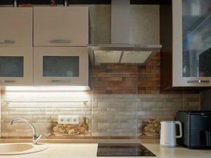 - кухня - гостиная: пол - керамогранит, стены - декоративный кирпич;
