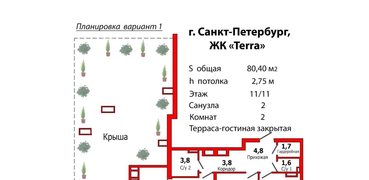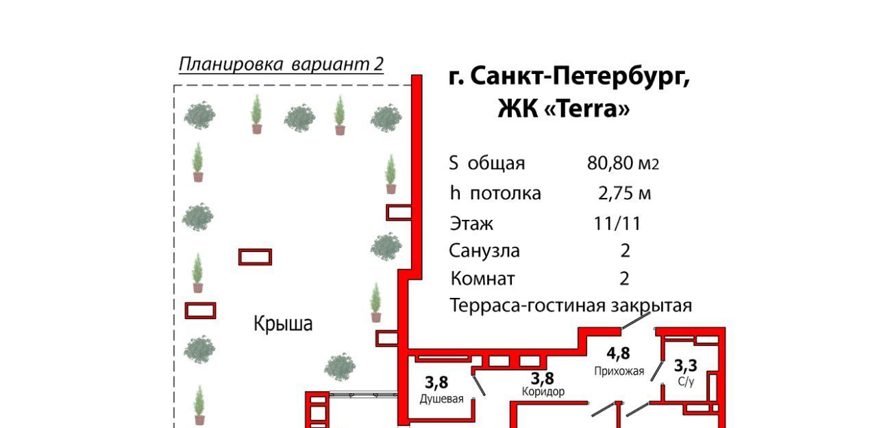Эксклюзивная 2-комнатная квартира с закрытой и открытой террасами на 11/11 этаже всего с двумя квартирами на площадке и с видом на телебашню в ЖК "Терра" и прямым выходом из ЖК в Пионерский сад с прудом!