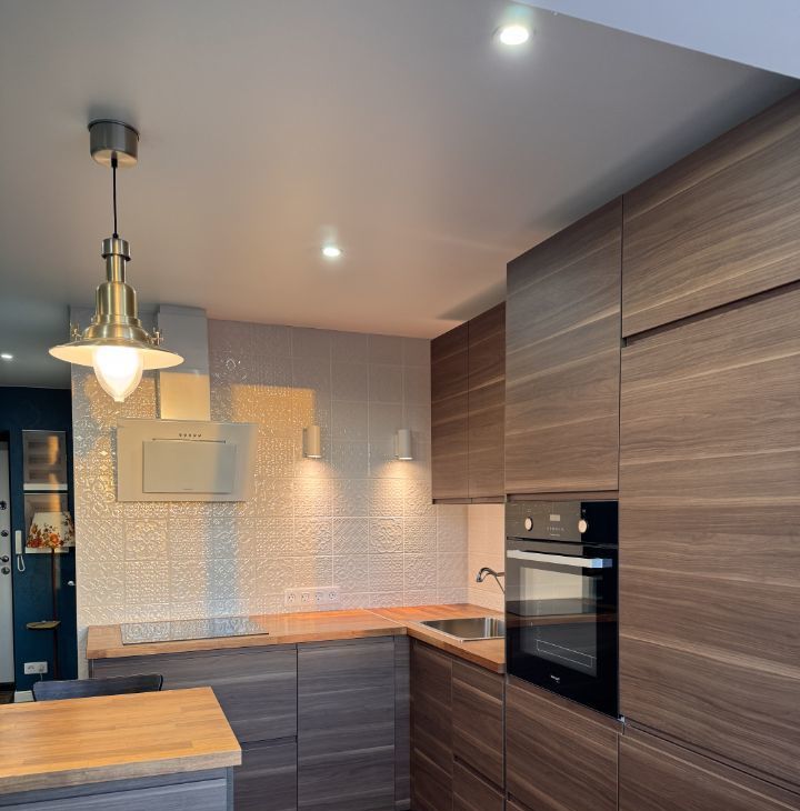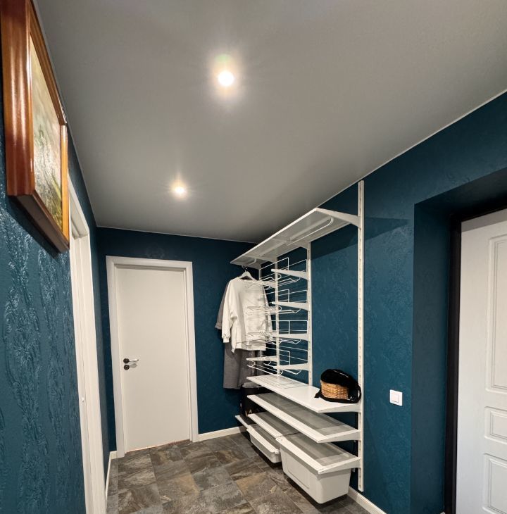 - На кухне: посудомойка на 40см, встроенный холодильник, духовой шкаф, керамическая варочная панель, чайник.