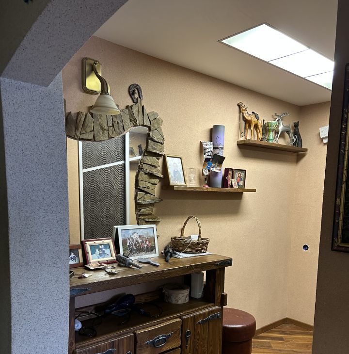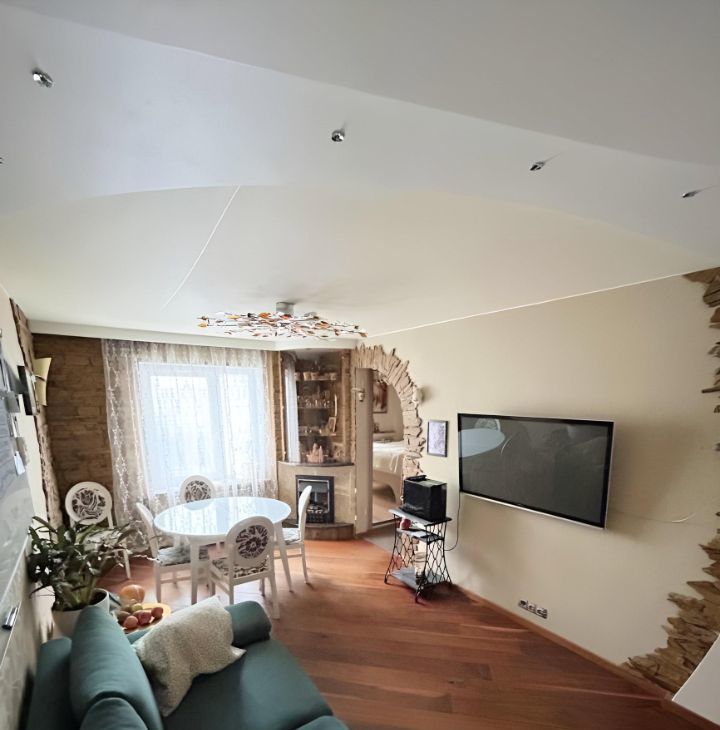 В гостиной есть камин для уюта и обогрева в межсезонье. Небольшого размера кухни вполне достаточно для комфортного и удобного время препровождения одной хозяйки. Стены в квартире штукатурка, частично натуральные обои из растительных материалов. В детской полы и стены ламинат, имитация яхты. Полы в квартире паркетная доска и дизайнерская плитка. Теплый пол: прихожая, ванная, кабинет, кухня. В ванной комнате душевая кабина Jacuzzi с гидромассажем и парогенератором. Ванная с двумя мощными моторами для гидромассажа размером 2*1.2 метра.