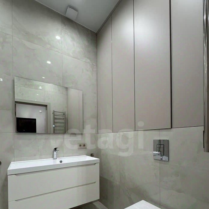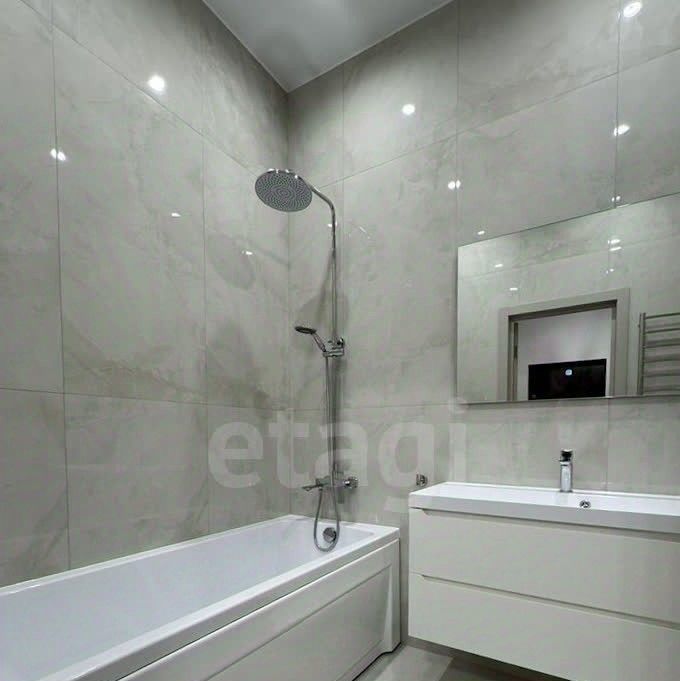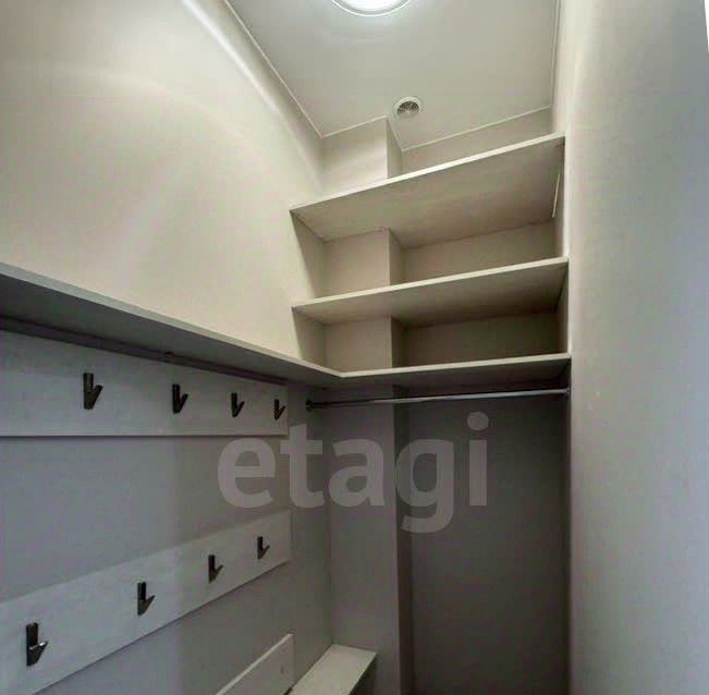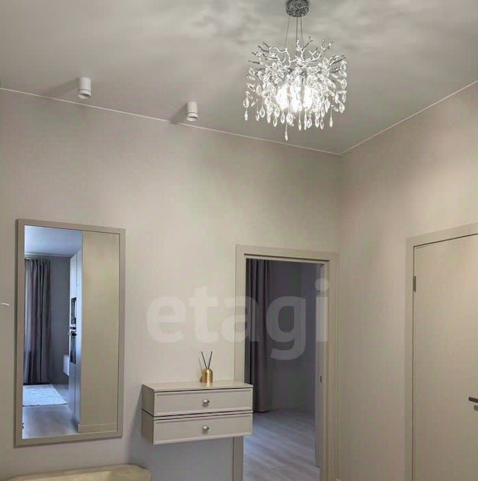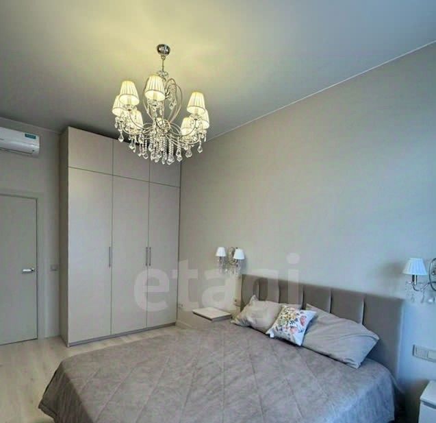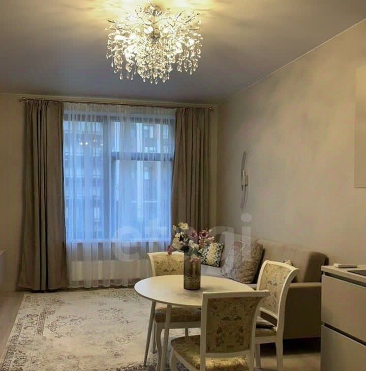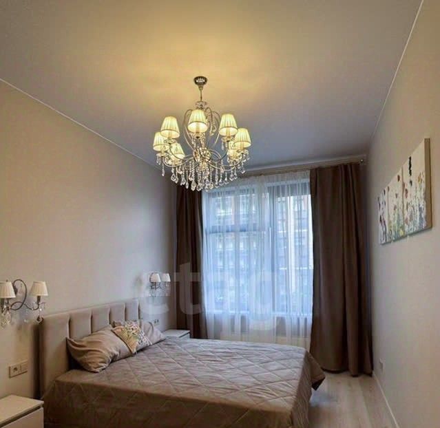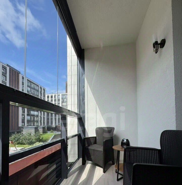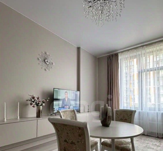 Просторная кухня, совмещённая с гостиной, застеклённая лоджия, гардеробная и совмещённая ванная комната. Две изолированные комнаты. Одна оборудована как спальня, вторая свободна.