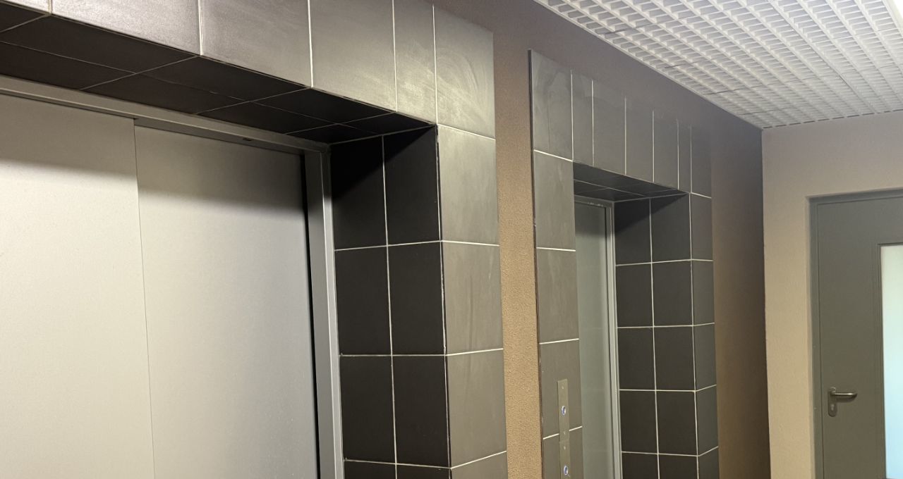 Большой холл с отдельной колясочной. 3 скоростных лифта OTIS