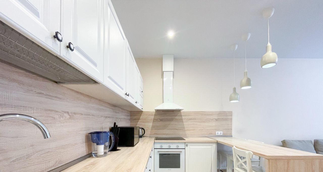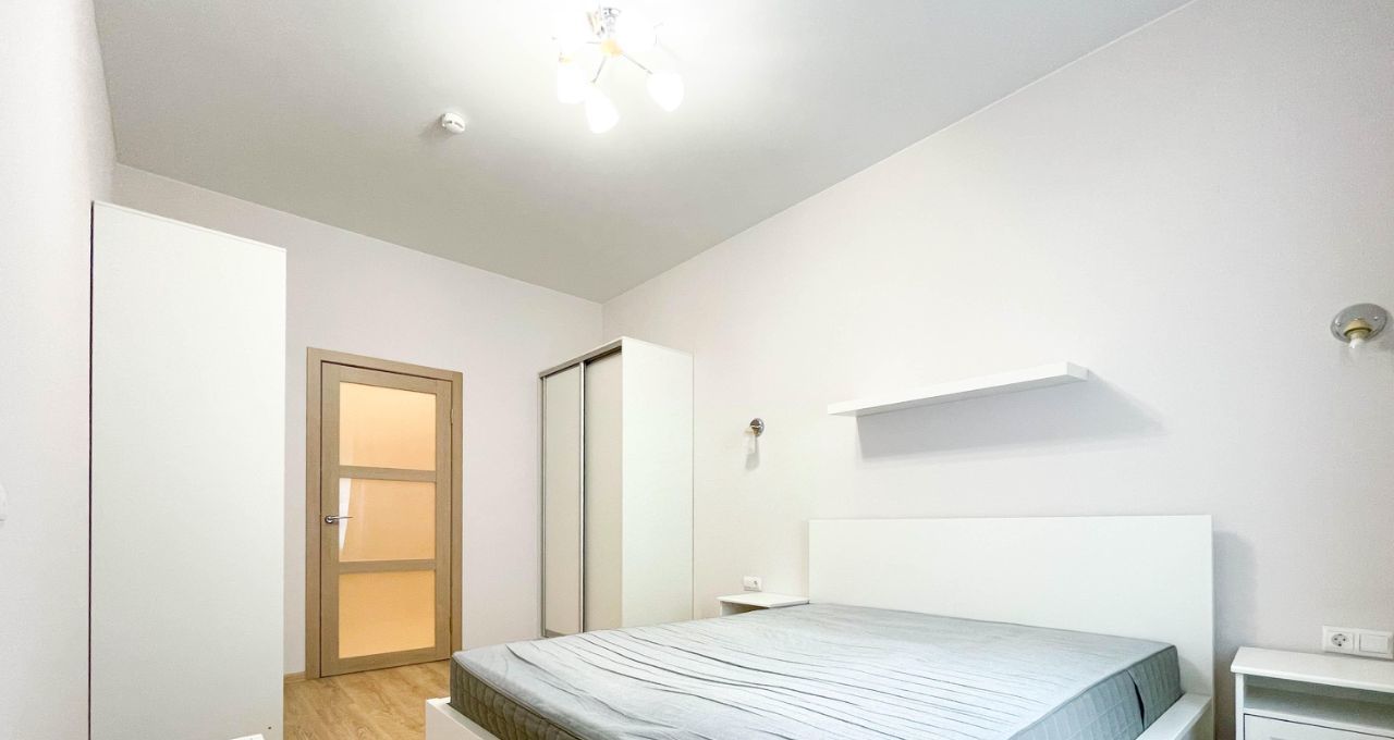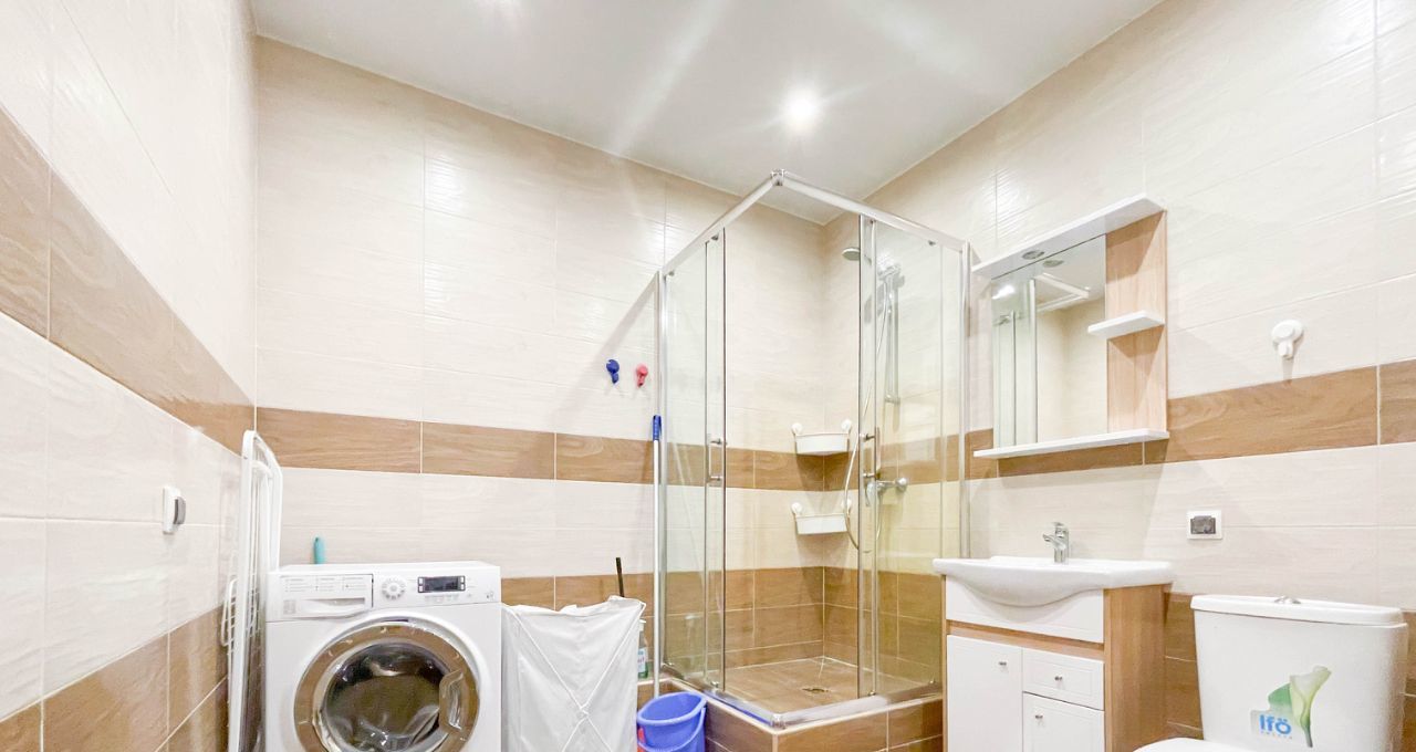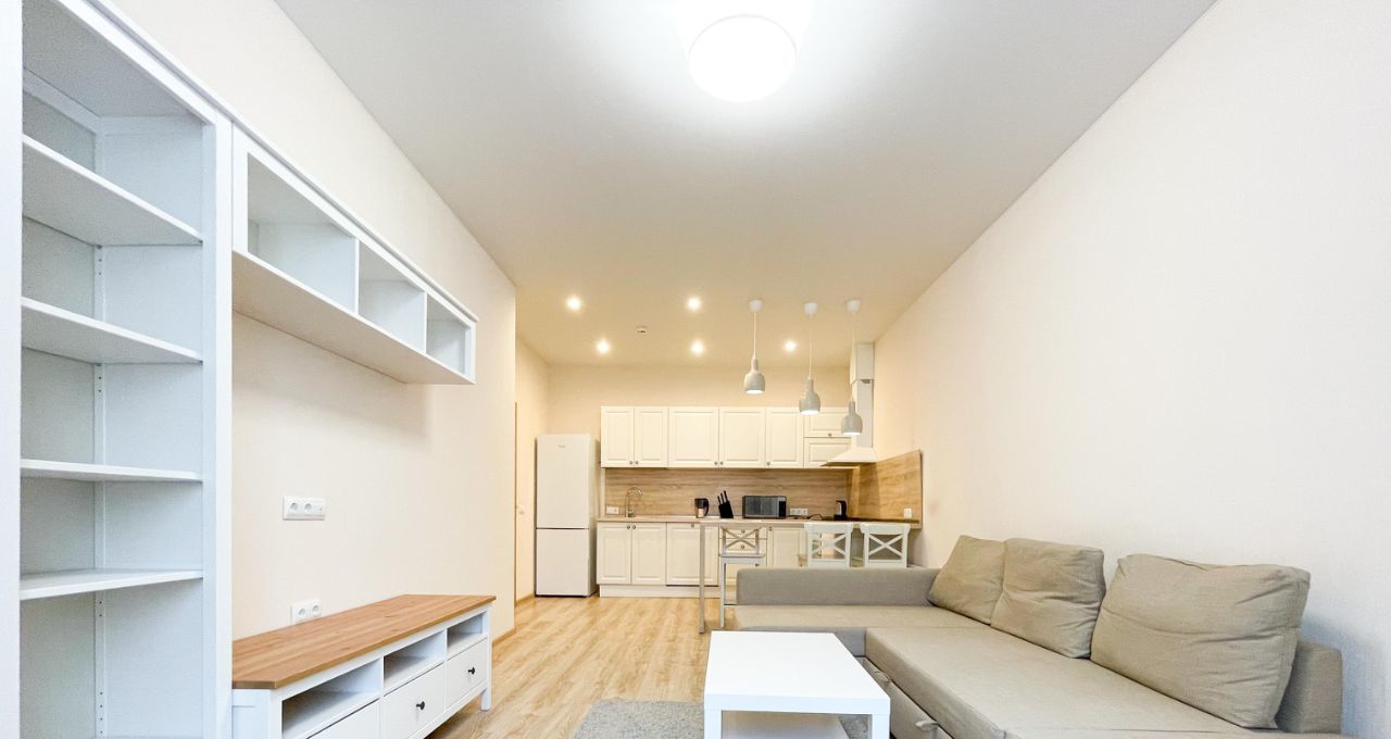 Просторная кухня-гостиная, светлая спальня и большой совмещенный санузел с душевой кабиной.