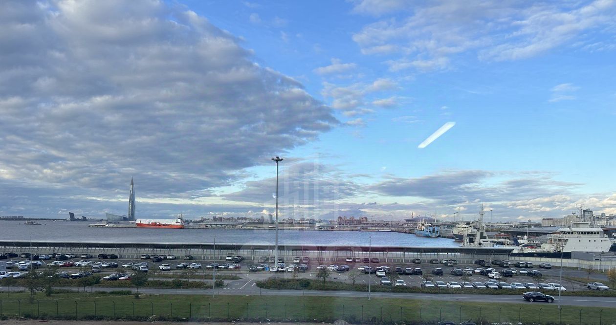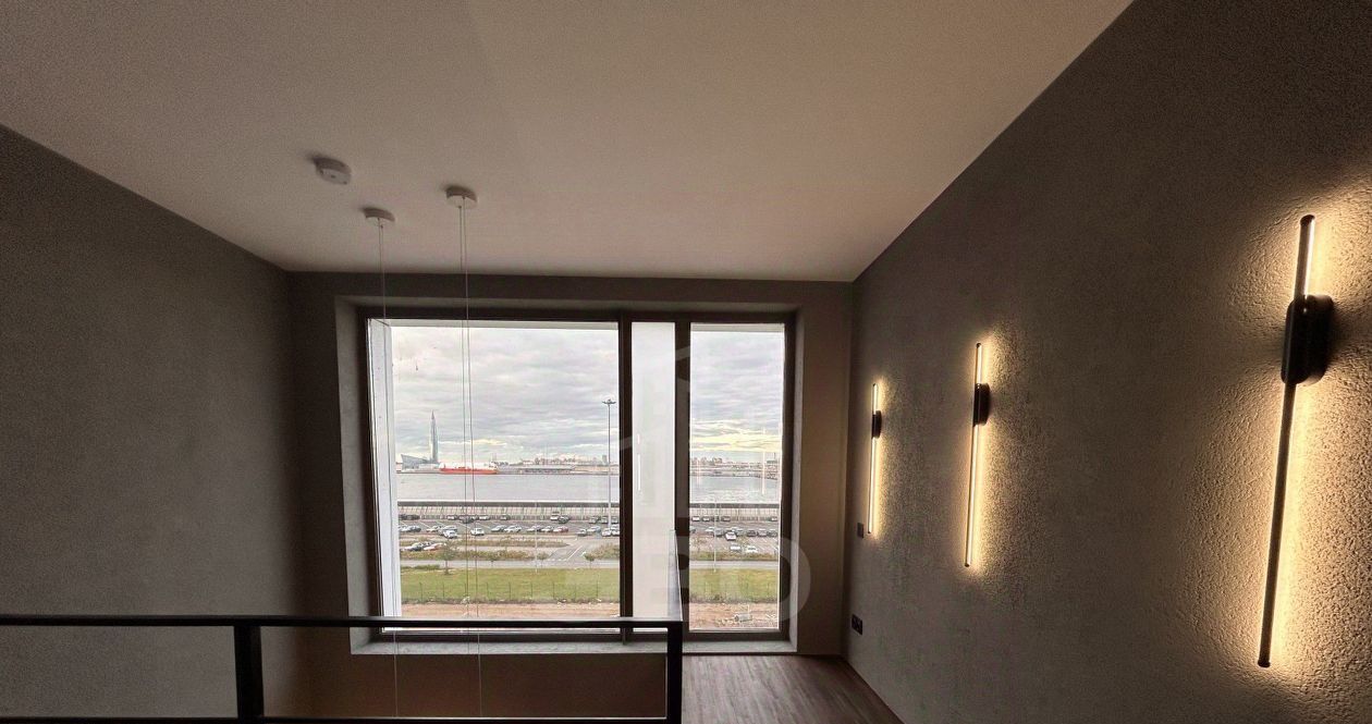 В квартире сделан отличный ремонт, большое количество света. Шикарное панорамное окно с видом на башню Лахта центра, Финский залив и морской порт.