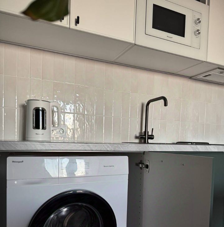 телевизор, стиральная машина, варочная панель, микроволновка, чайник.