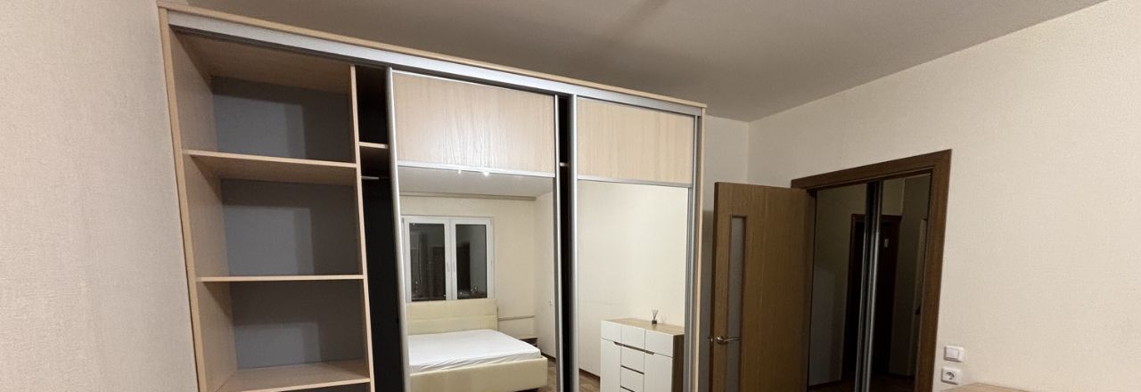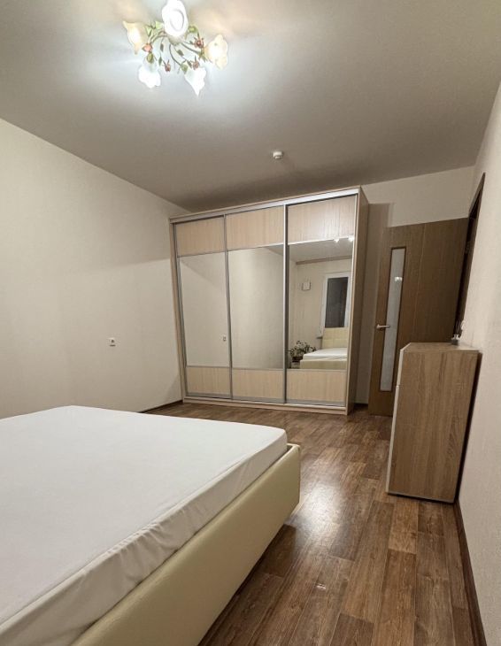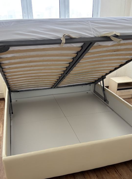 Большая спальная 18 кв м с двуспальной кроватью с подъемным механизмом и ортопедическим матрасом. Вместительный шкаф для хранения вещей и комод.
