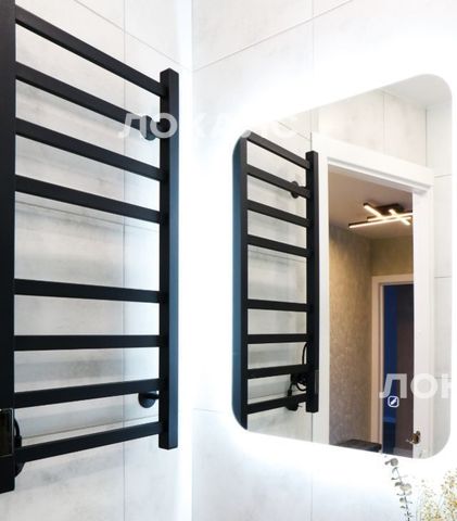 - Ванная с просторным душем, зеркалом с подсветкой, тумбой для хранения и электрическим полотенцесушителем.