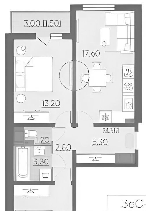Кухня-гостинная 17,5 м2 и две отдельные комнаты. Коммунальные услуги примерно 8000 руб.