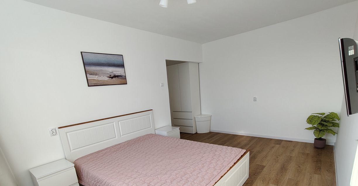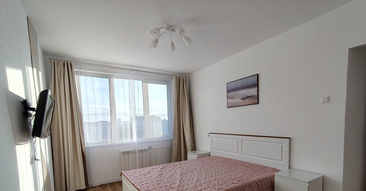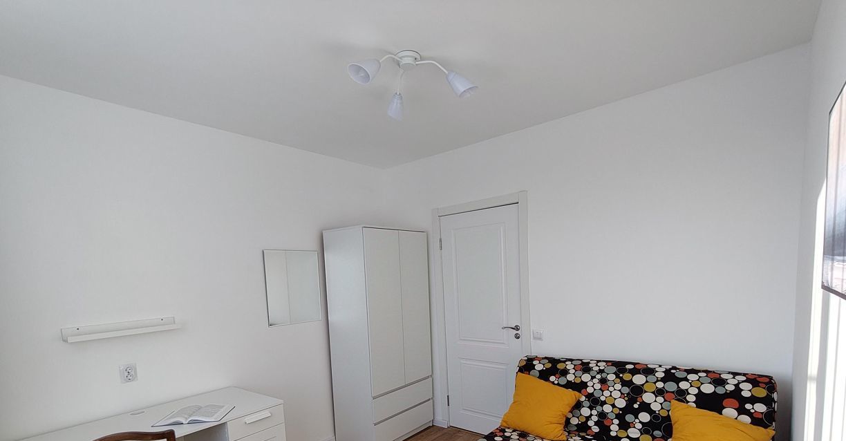 В спальне установлен телевизор, шкаф для хранения вещей и большая двухспальная кровать с ортопедическим матрасом и двумя тумбочками. В маленькой комнате удобный раскладной диван и письменный стол с вместительной тумбой, шкаф для одежды и зеркало.