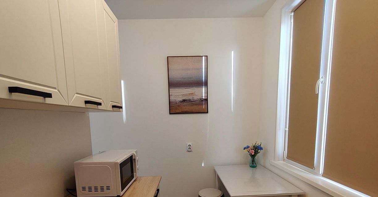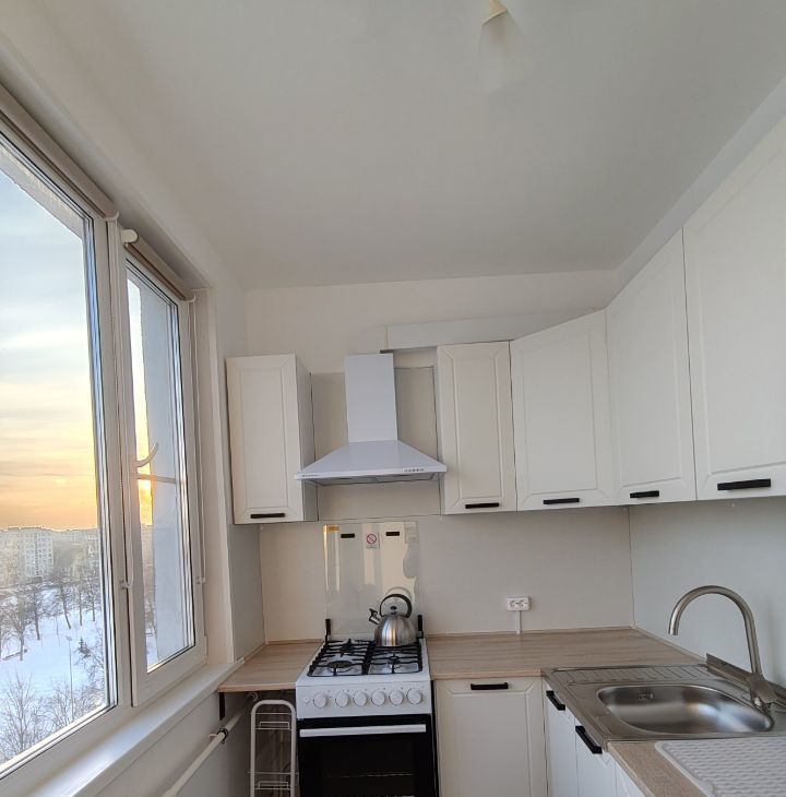 Кухня светлая и просторная, оснащена необходимой бытовой техникой, включая холодильник и плиту, вытяжку, микроволновую печь, чайник. Окна выходят на зелёный сквер, в котором в прошлом году была произведена реконструкция, оснащен фонарями, местами для отдыха и прогулок. Парковка расположена по улице Евдокима Огнева, а так же во дворе дома.