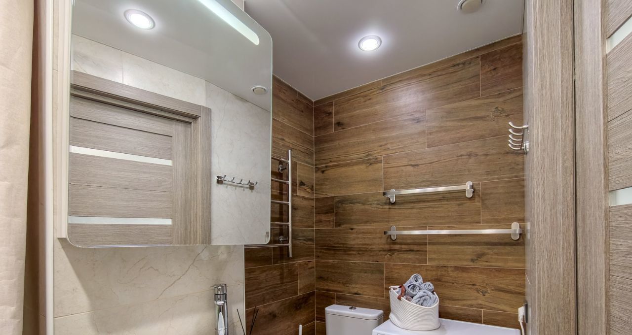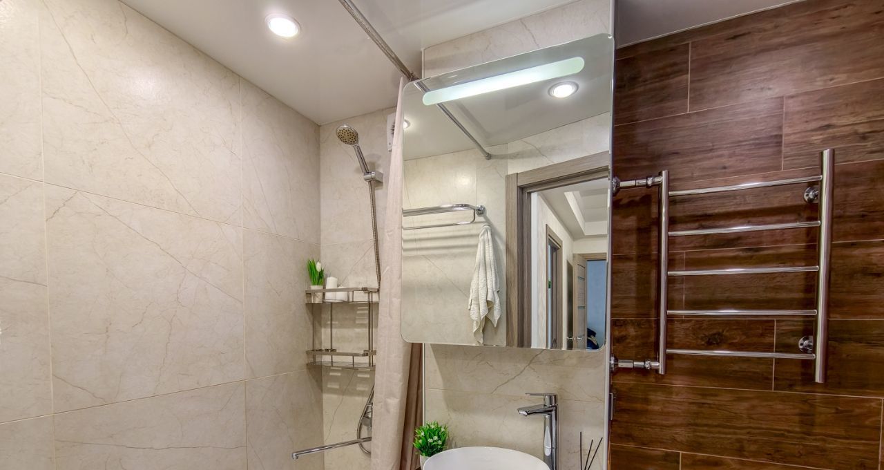 — Евроремонт. Без креатива 90-х. Просто, светло, аккуратно. Санузел совмещённый — меньше мыть, больше места. Ванна, стиралка, унитаз — всё новое и работает.
