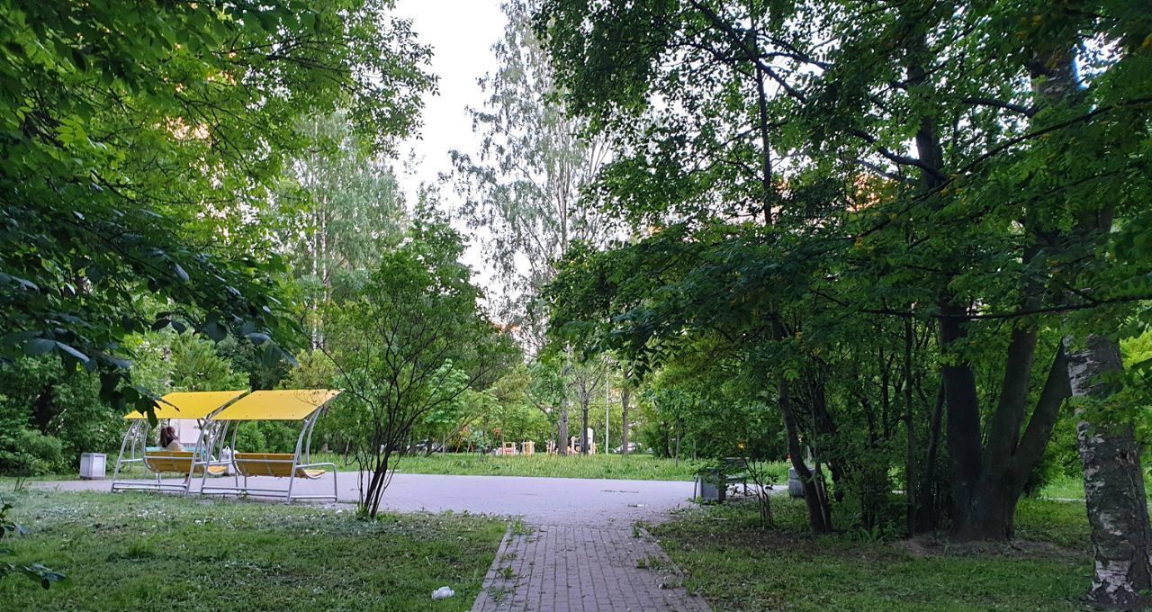 Огромный зеленый двор с детской площадкой.