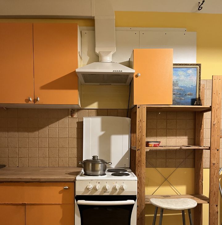 Из техники - вытяжка с отводом в трубу, плита электрическая, духовка работает отлично. Холодильник большой, чистый, не шумный.