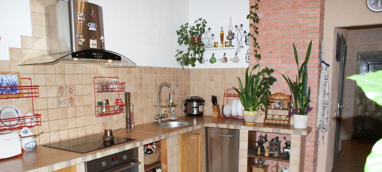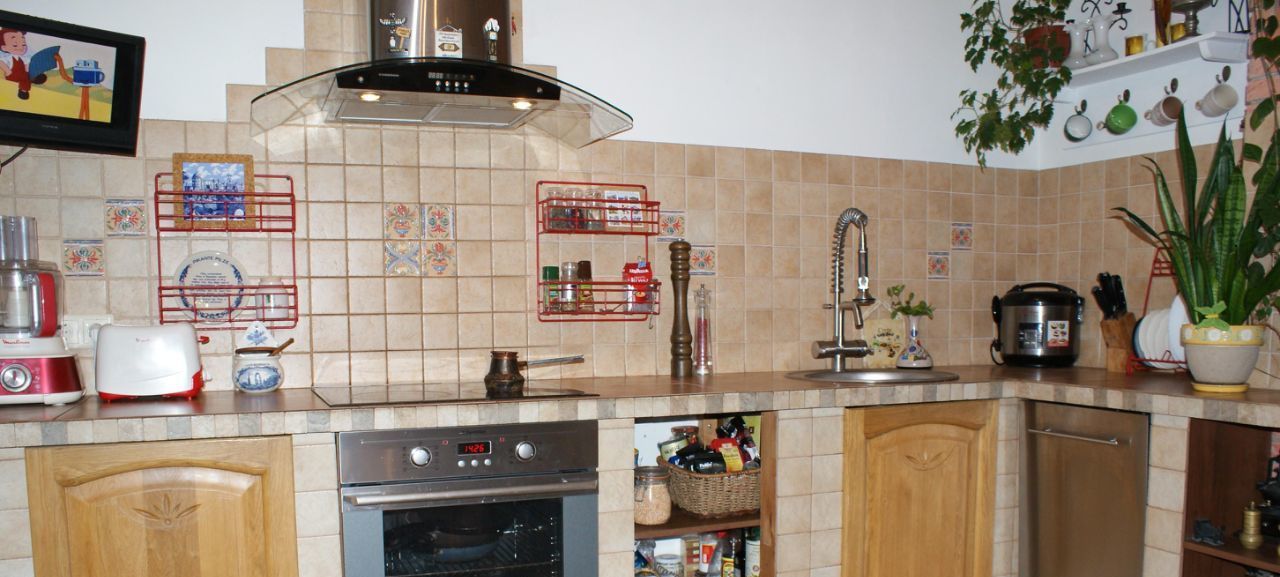 Кухонная мебель - фасады из массива дуба; отделка плиткой котто.