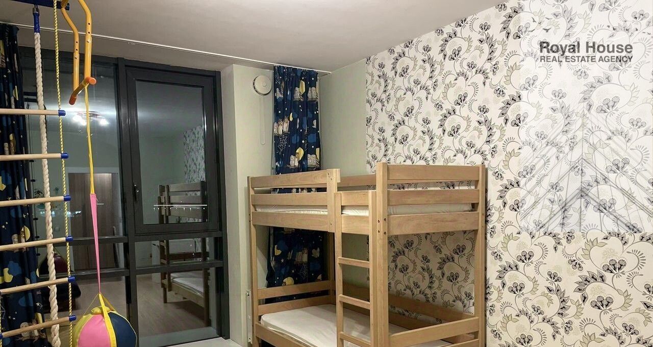 Детская комната с панорамным остеклением, двухъярусной кроватью (ортопедические матрасы Ormatek), раскладным диваном IKEA и спортивным уголком.