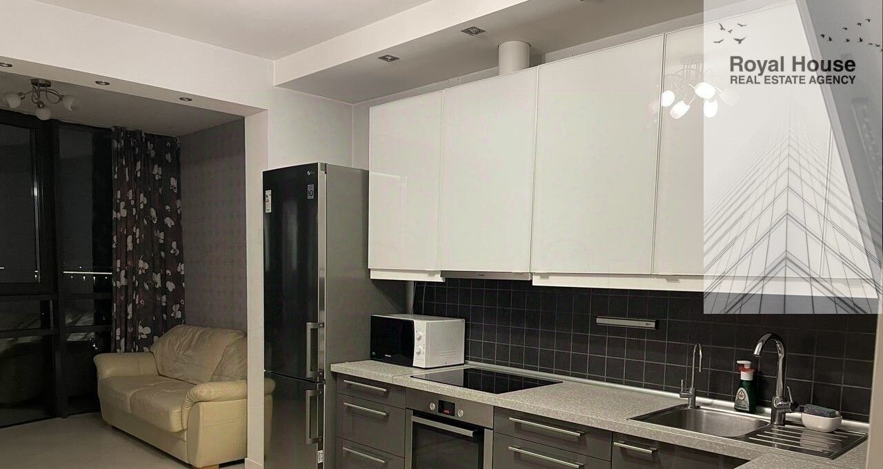 Просторная кухня-гостиная с выходом на застекленный балкон (панорамные окна в пол), оборудована всей техникой: индукционная плита, духовой шкаф, микроволновка, посудомоечная машина, вытяжка, холодильник. На балконе — раскладной диван.
