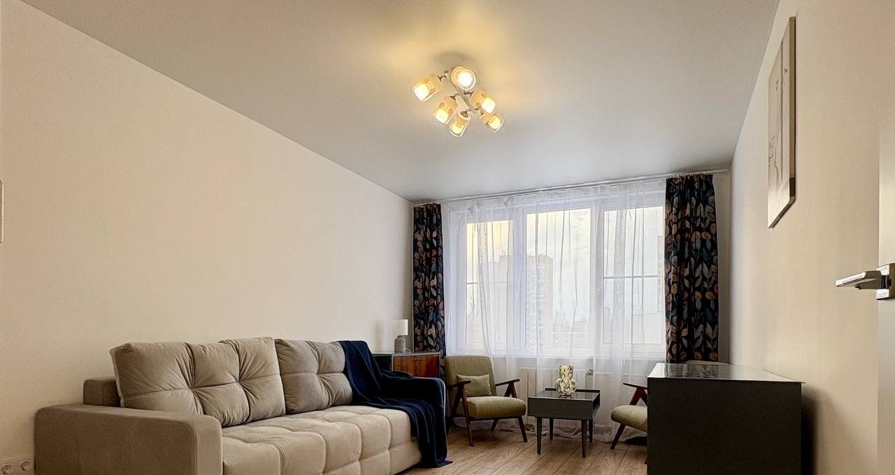 Впервые сдаётся светлая уютная квартира с дизайнерским ремонтом 2026 года в стиле Советского модернизма. Винтажная реставрированная мебель времён 70-х великолепно интегрирована в современный интерьер. Новая кухня с регулирующим пространство столом, новая бытовая техника, есть посудомойка, стиральная машина встроена в ванной под раковину. В гостиной 15,5м2. новый диван, встроенная зона хранения. В маленькой комнате 12,7м2. оставили полуторную кровать, при необходимости готовы купить матрас или новую тахту(по желанию арендатора). Новые стеклопакеты, новая электрика, современная разводка водоснабжения, фильтры. Тихий двор в окружении деревьев, интеллигентные соседи. Фасад дома отреставрирован в 2022 году, косметический ремонт парадной в 2025 году. Развитая инфраструктура: рядом школа, детский сад, парки, магазины, метро в трёх остановках, удобный выезд на КАД. Для одного, пары, можно с ребёнком. Кошачьих не рассматриваем категорически, собак индивидуально. Квартира свободна, просмотры по договорённости.