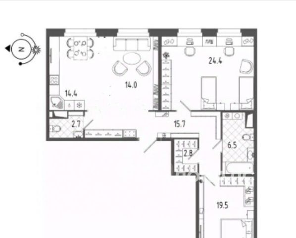-Современная, светлая квартира 103 м² с двумя изолированными спальнями и большой кухней - гостиной 28 м²;