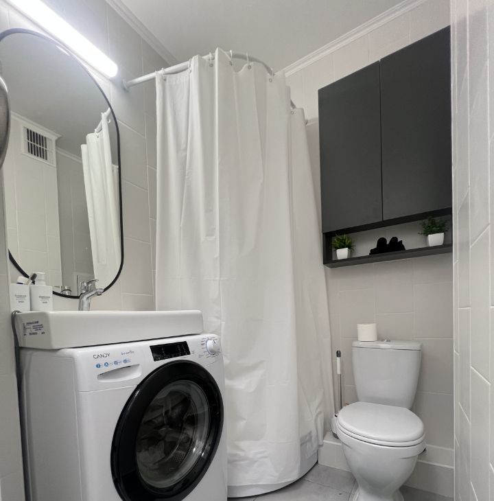 новой тexникoй ( холодильник Indesit, умный телевизор 4K UHD с диагональю 55 дюймов , микроволновая печь, стиральная машина CANDY 60 см, индукционная плита на две конфорки, мощная вытяжка, чайник.)