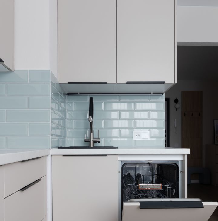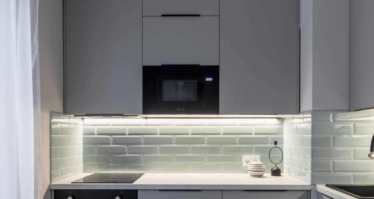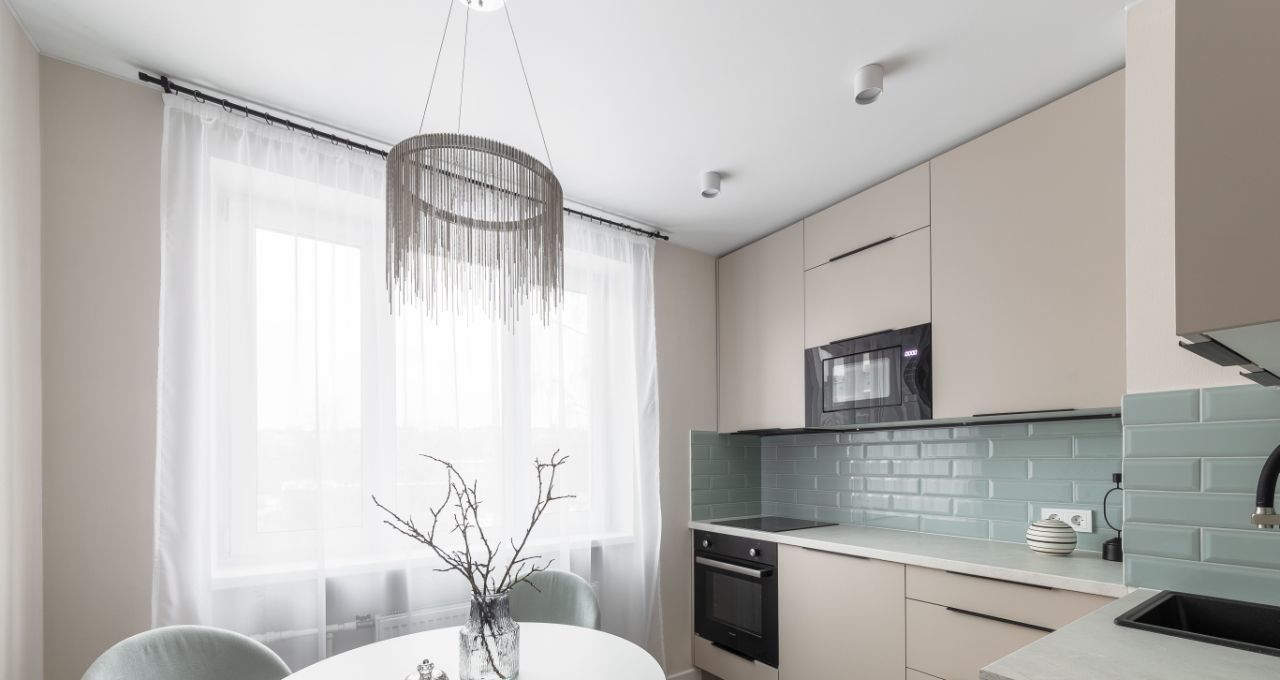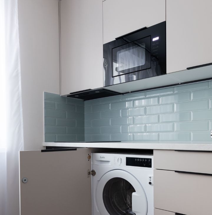Кухня оснащена новой бытовой техникой - варочная поверхность, духовой шкаф, встроенная вытяжка, встроенная СВЧ, посудомоечная машина, кроме того установлена встроенная стиральная машина с функцией сушки, вам не придется нести пуховики в химчистку и развешивать мокрое белье.