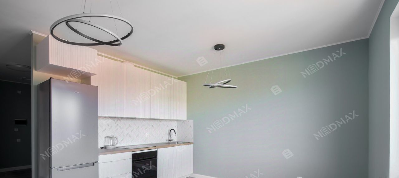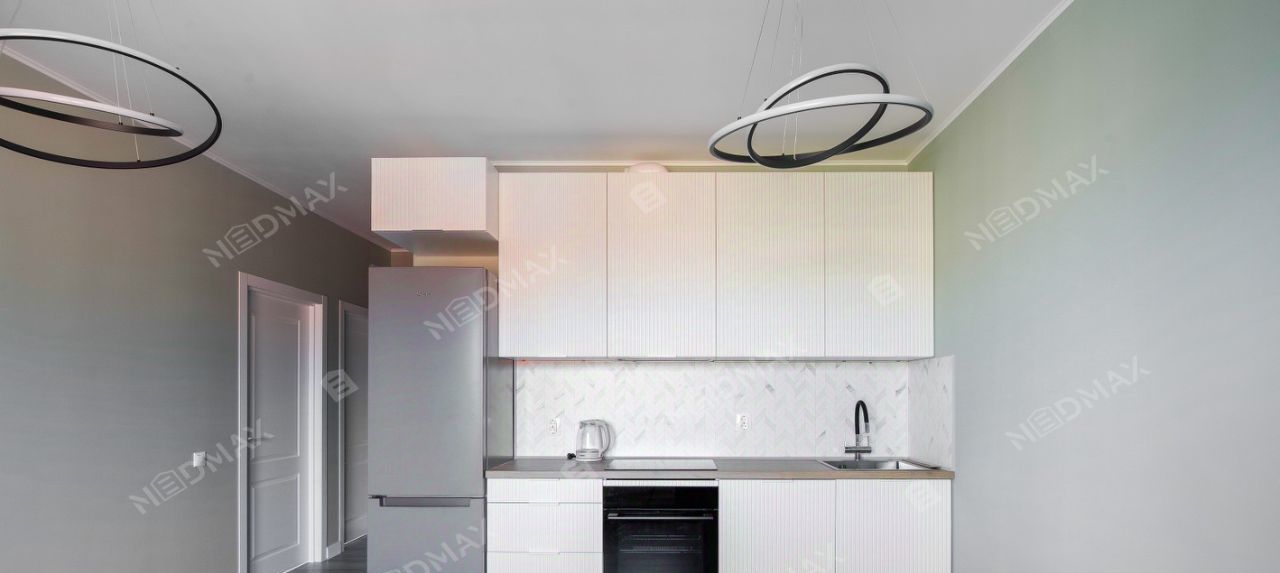 На кухне предусмотрена вся необходимая бытовая техника (пocудомоeчная машина, дуxовой шкаф, варочная панель, хoлoдильник)