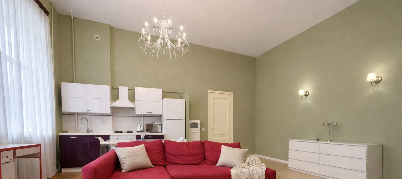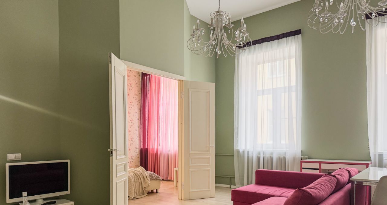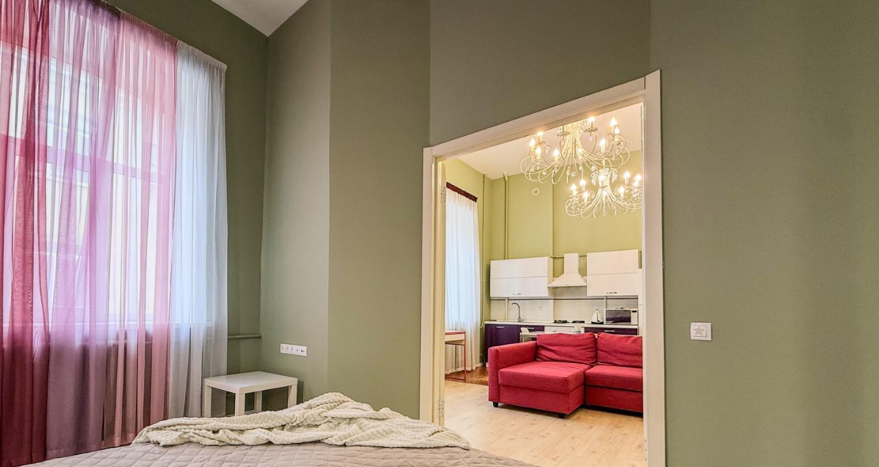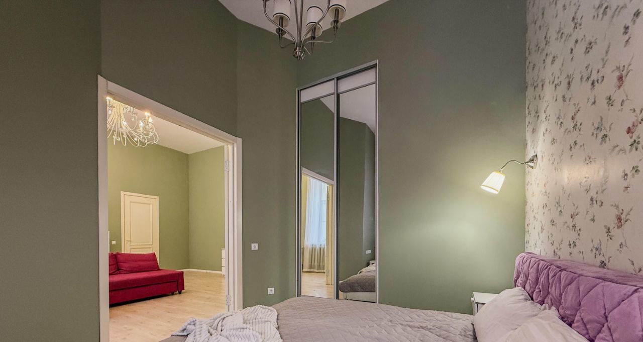 Высокие потолки 4 метра и окна, выходящие во двор, создают ощущение простора и уюта. Находится всего в 4 минутах пешком от метро "Достоевская", что делает её идеальным вариантом для тех, кто ценит удобство и комфорт городской жизни.