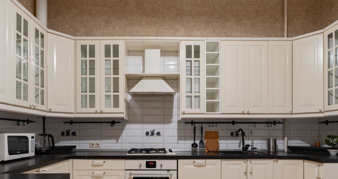 Просторная кухня с посудой и всей необходимой техникой (микроволновая печь, холодильник, чайник, плита, духовой шкаф, посудомоечная машина).