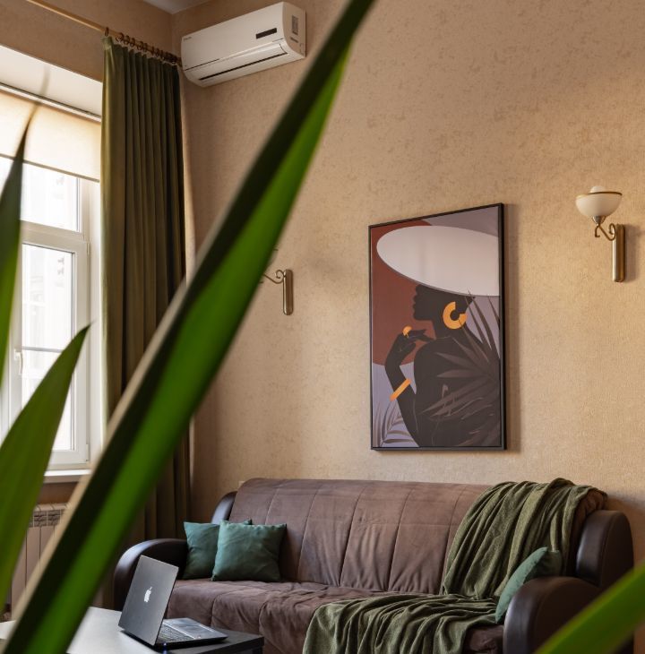 Просторная гостиная с высокими потолками, большим диваном.