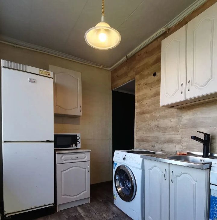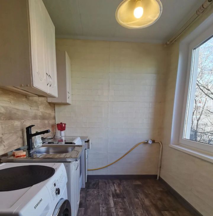 - В кухня оснащена кухонным гарнитуром, газовой плитой, стиральной машиной и микроволновой печью