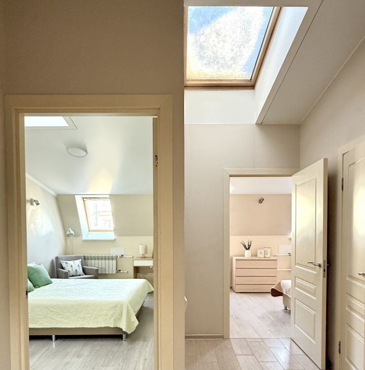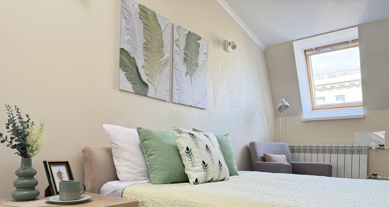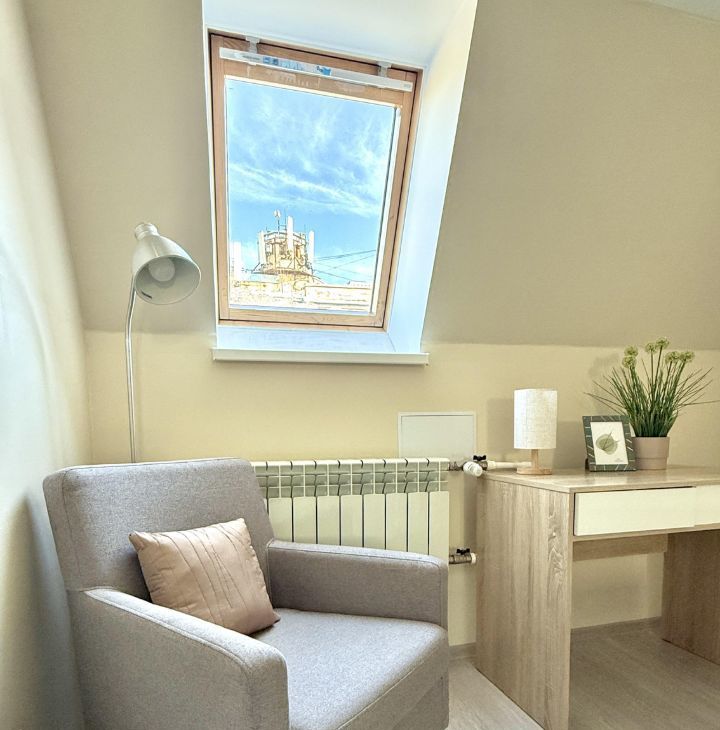 Уютная светлая современная квартира на мансардном этаже исторического дома. Престижный центр города, до метро 3 мин., хорошая транспортная доступность.