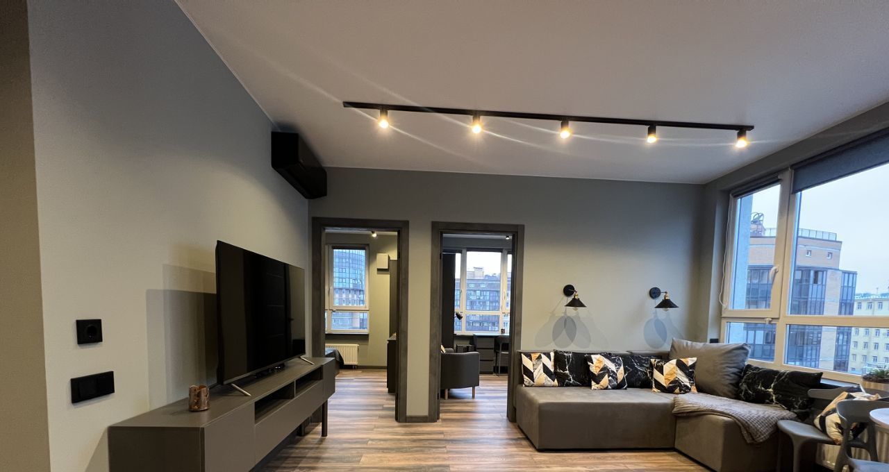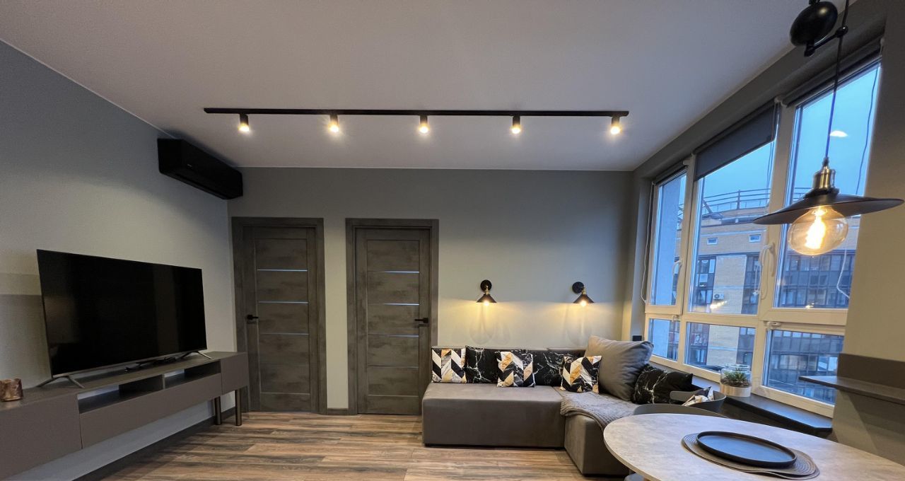В квартире много естественного света и воздуха. Во всех помещениях три варианта освещения - общее, точечное и теплое вечернее.