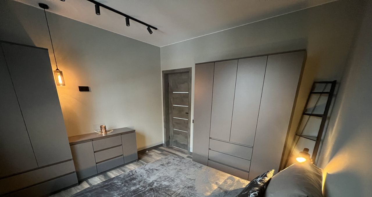 Спальня оборудована двуспальной кроватью с ортопедическим матрасом, вместительными гардеробными шкафами и комодом.