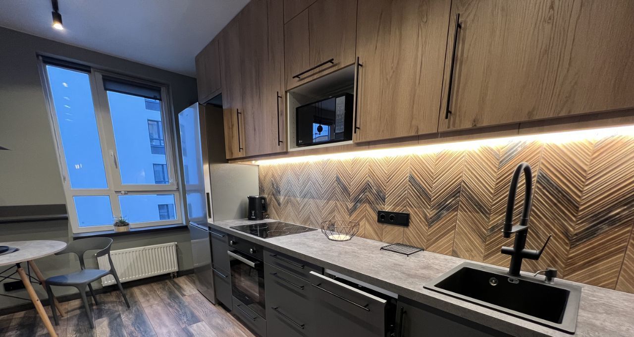 - стильный кухонный гарнитур с качественной встроенной техникой: посудомоечной машиной, варочной поверхностью, вытяжкой, духовым шкафом, двухкамерным холодильником, и дополнительными местами для хранения,