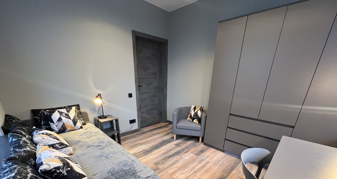 Вторая комната оборудована небольшим рабочим и спальным местом, с дополнительными местами для хранения, одежным шкафом и креслом.