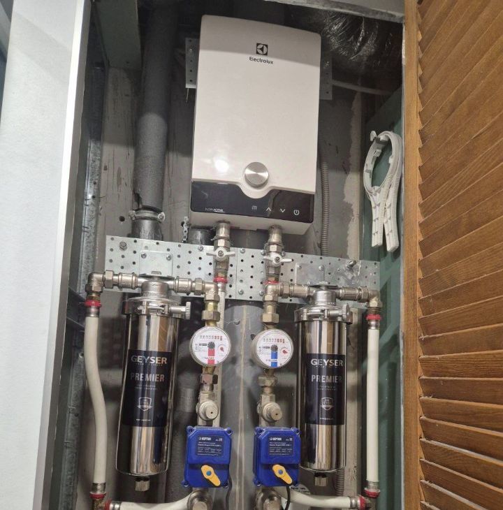 Современная европейская сантехника, установлены проточные фильтры для воды и проточный водонагреватель, система защиты от протечек Нептун.