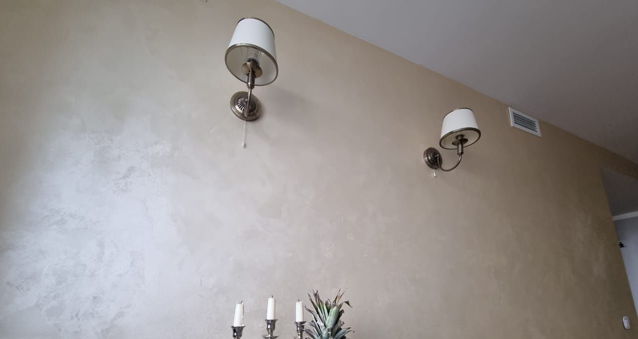 На полу паркет, на стенах - шелковая штукатурка и окрашенные обои.
