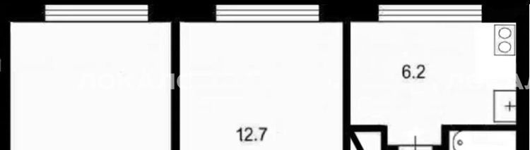 Площадь квартиры 45 кв.м (комнаты 19 кв.м. и 12 кв.м, кухня 6,5 кв.м.).