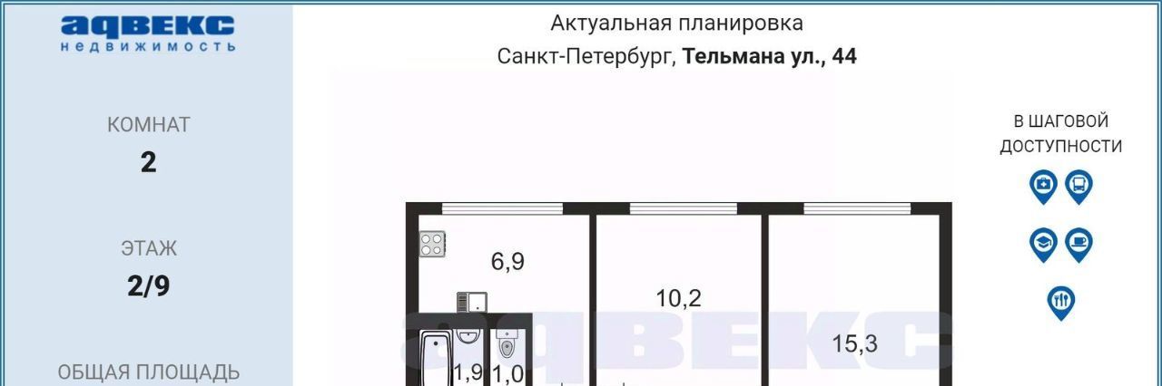 2-к кв. Санкт-Петербург ул. Тельмана, 44 (44.7 м²)