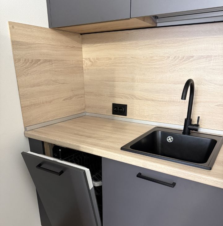 На кухне есть все необходимое: кухонный гарнитур, посудомоечная машина, холодильник, духовой шкаф, обеденный стол со стульями, диван и телевизор.