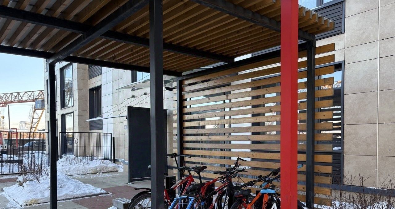 Во дворе есть детская площадка, велосипедная парковка, парковка для автомобилей за шлагбаумом или на улице Тосина.