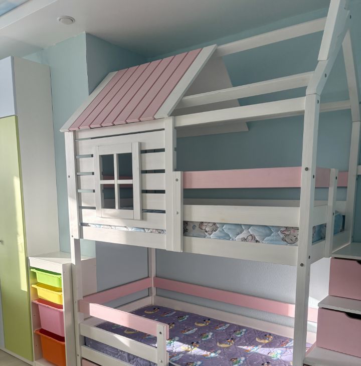 Детская: Функциональная двухъярусная кровать (спальное место 1600*800) + рабочее место (письменный стол и полки для хранения)+ шкаф.