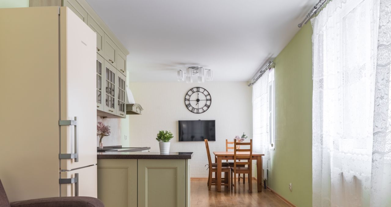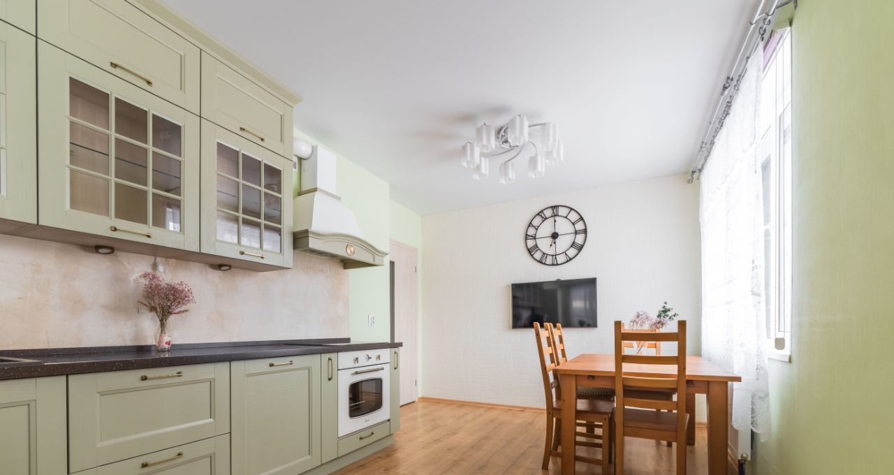- Вся техника: Smart TV, варочная панель, духовой шкаф, холодильник, микроволновая печь, стиральная машина.