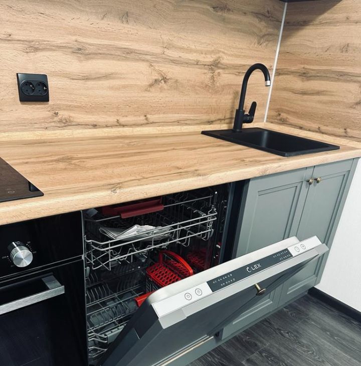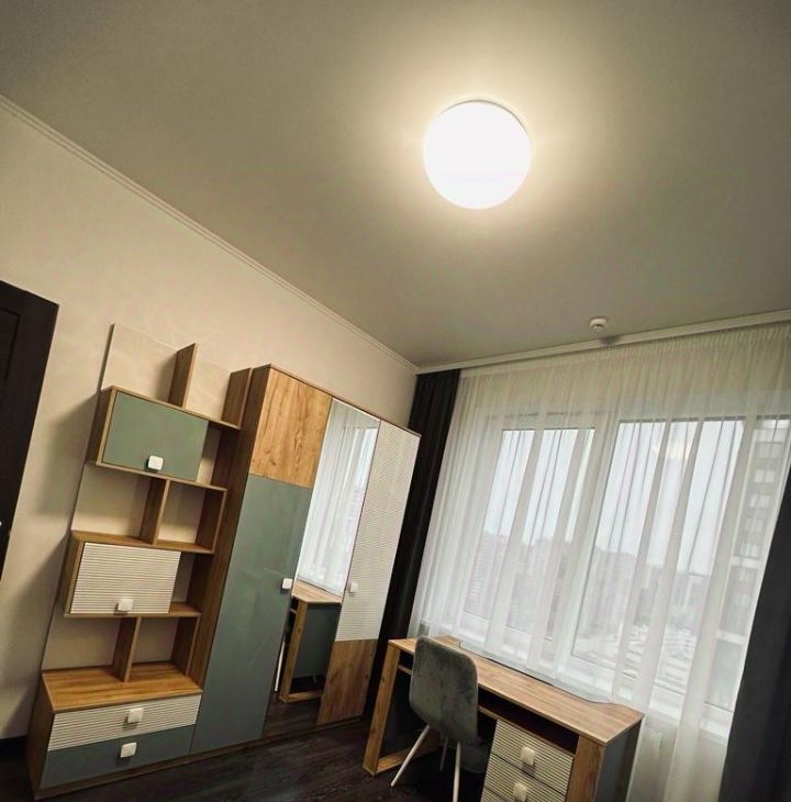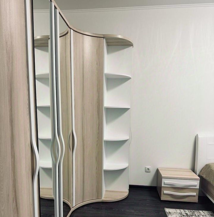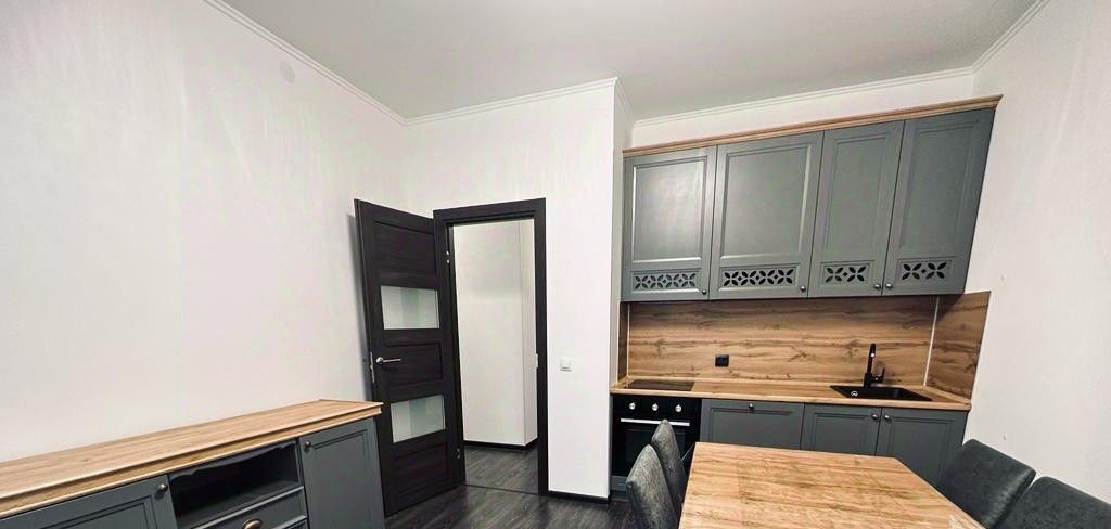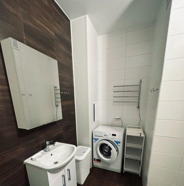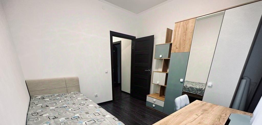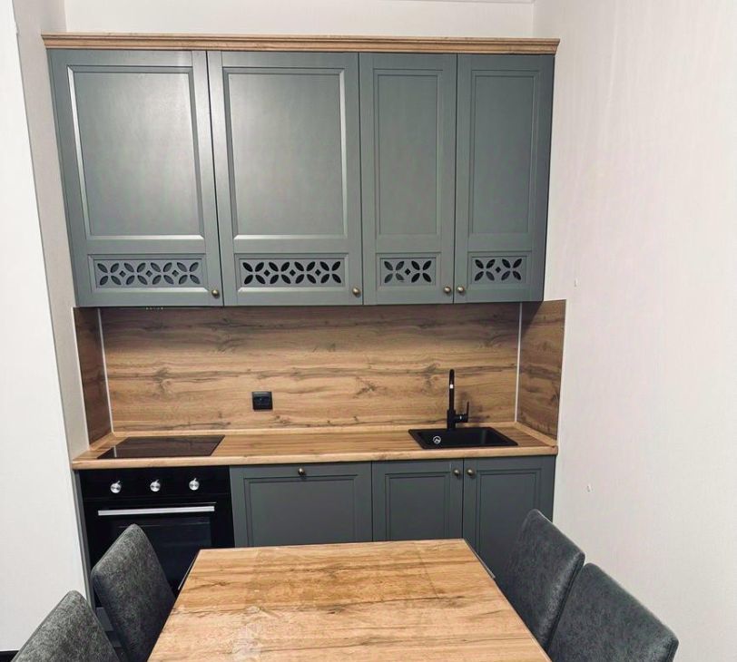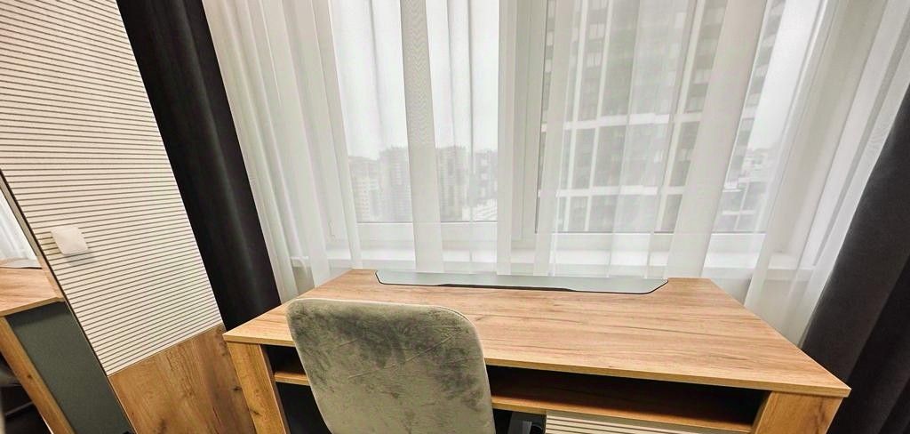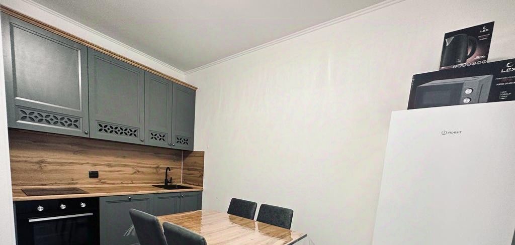 Укомплектована всей необходимо новой мебелью и новой техникой для Вашего комфортного проживания. Кухня: удобная в использовании мебель со встроенной посудомоечной машиной, духовым шкафом, варочной панелью, вытяжкой, СВЧ., обеденный стол, стулья, тумба. Спальня: двухместная кровать, большой шкаф, прикроватные тумбочки. Комната: односпальная кровать рабочий, стол + стул, шкаф. Сан. узел раздельный, пол с подогревом.