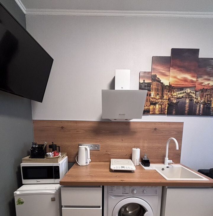 Кухонная зона ( чайник, посуда, холодильник,СВЧ печь )