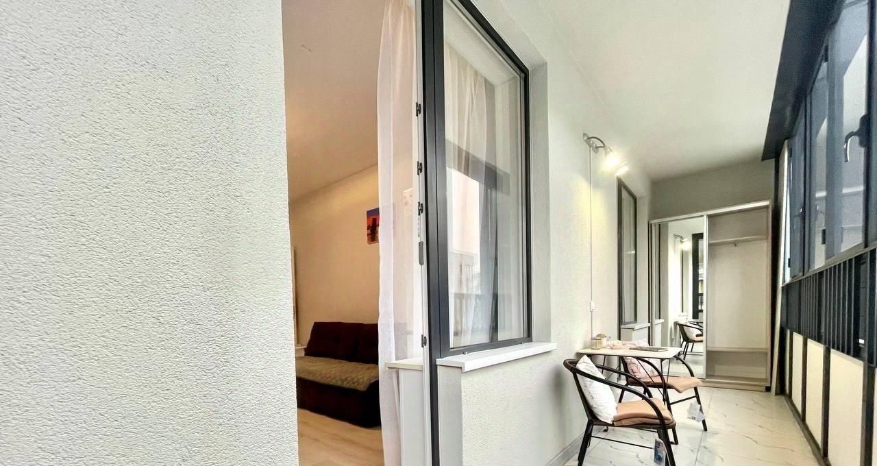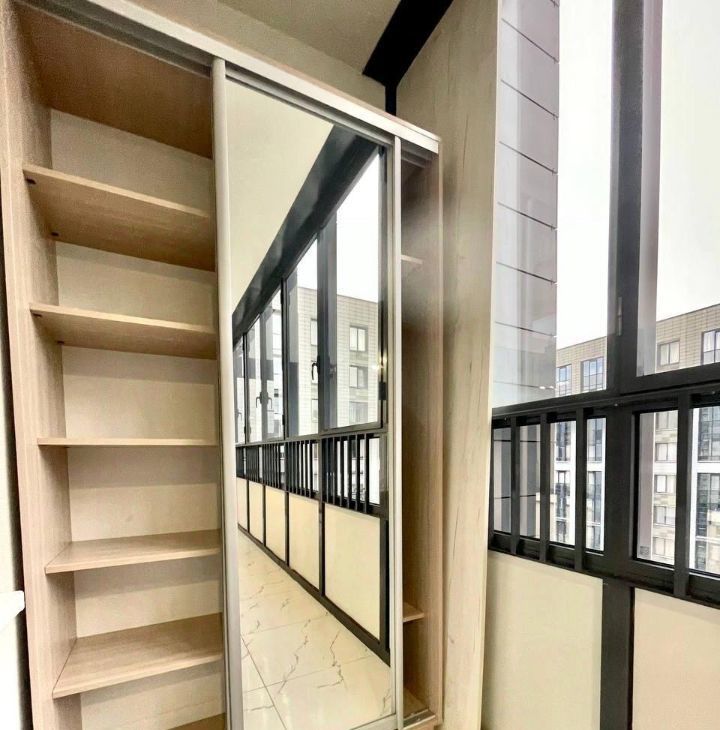 Просторный застекленный балкон с шкафом-купе выход на который осуществляется через кухню и спальню.