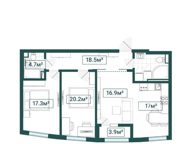 + две спальни 20,2 кв.м. и 17,3 кв.м;