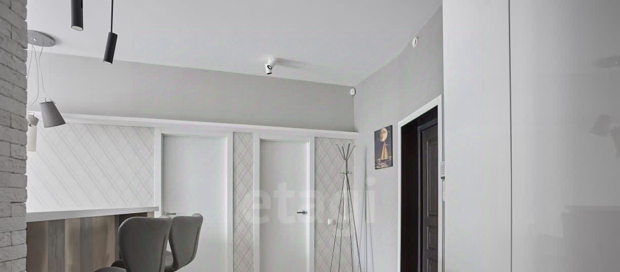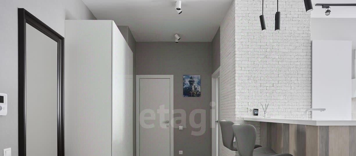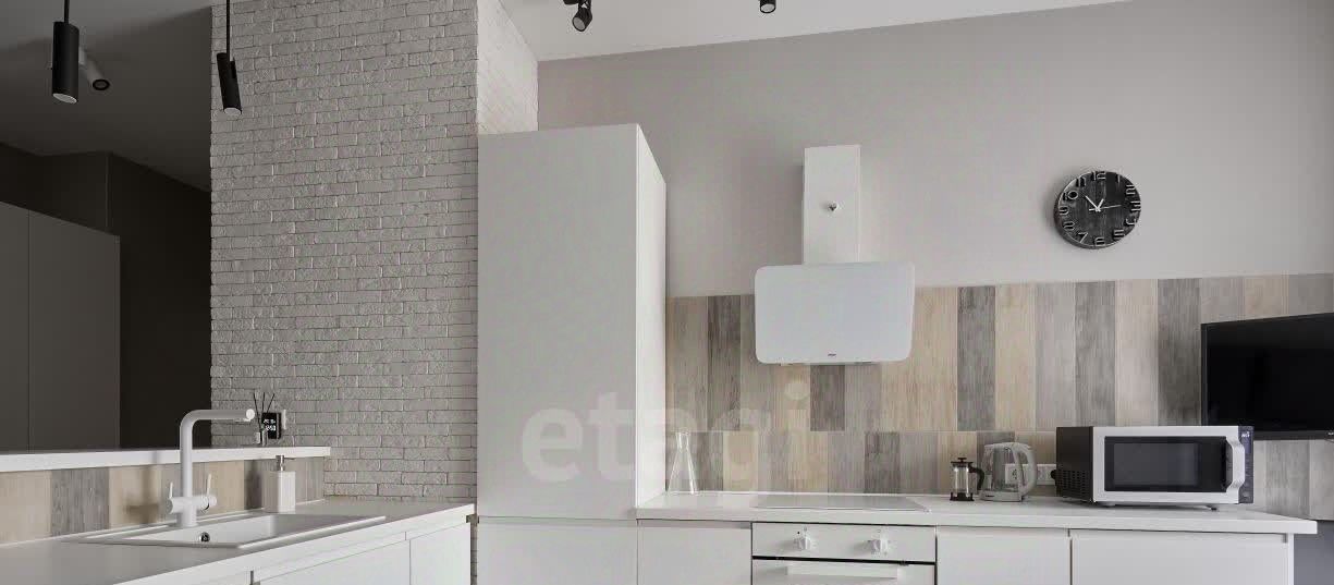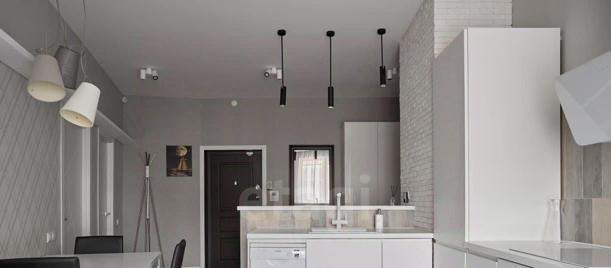 Большая кухонная зона оснащена всей необходимой бытовой техникой и объединена с просторным коридором, отграниченная барной стойкой.