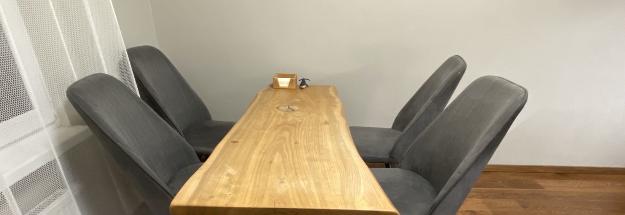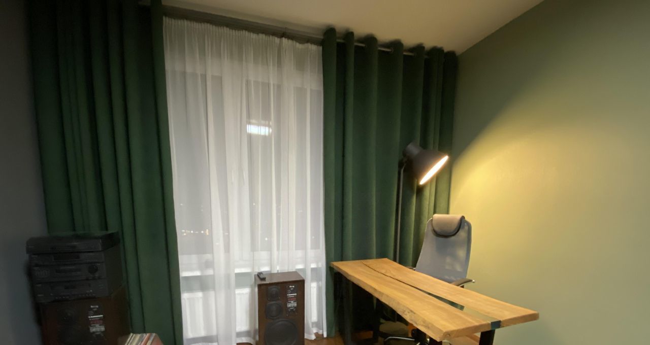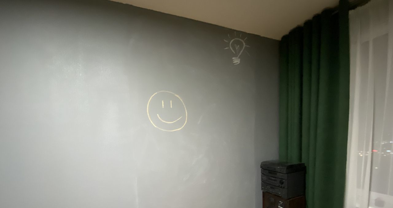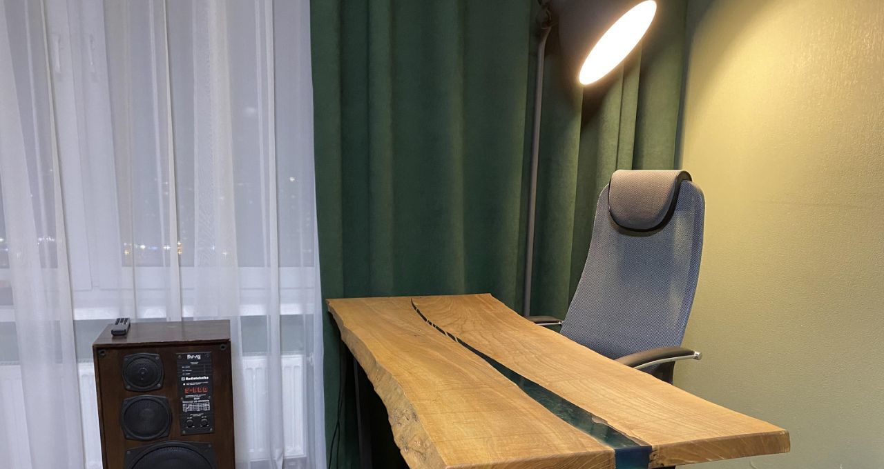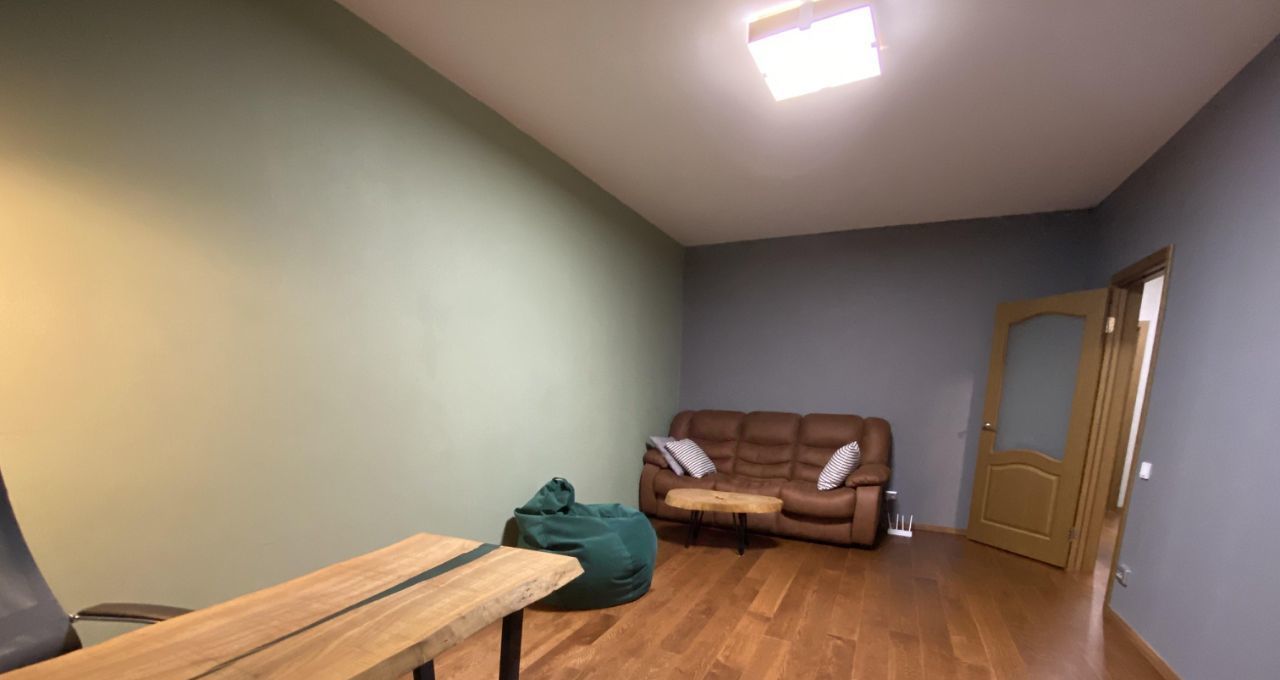 В гостиной диван, раскладывается на два спальных места, дизайнерский рабочий стол из слэба вяза с эбокситкой, напротив рабочего стола на стену нанесена специальная графитовая краска, которая позволяет рисовать мелом, ширина полотна ~2 метра.
